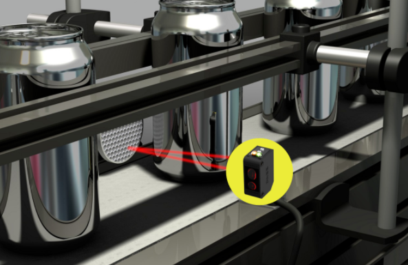 在此應用中,傳感器設計為僅檢測由反射板返回的光線。當未完工的易拉罐行經傳感器和反射板之間時,從易拉罐反射的光線與從反射板返回的光線具有不同的光波。因此,光束會被易拉罐阻擋住,進而觸發輸出。