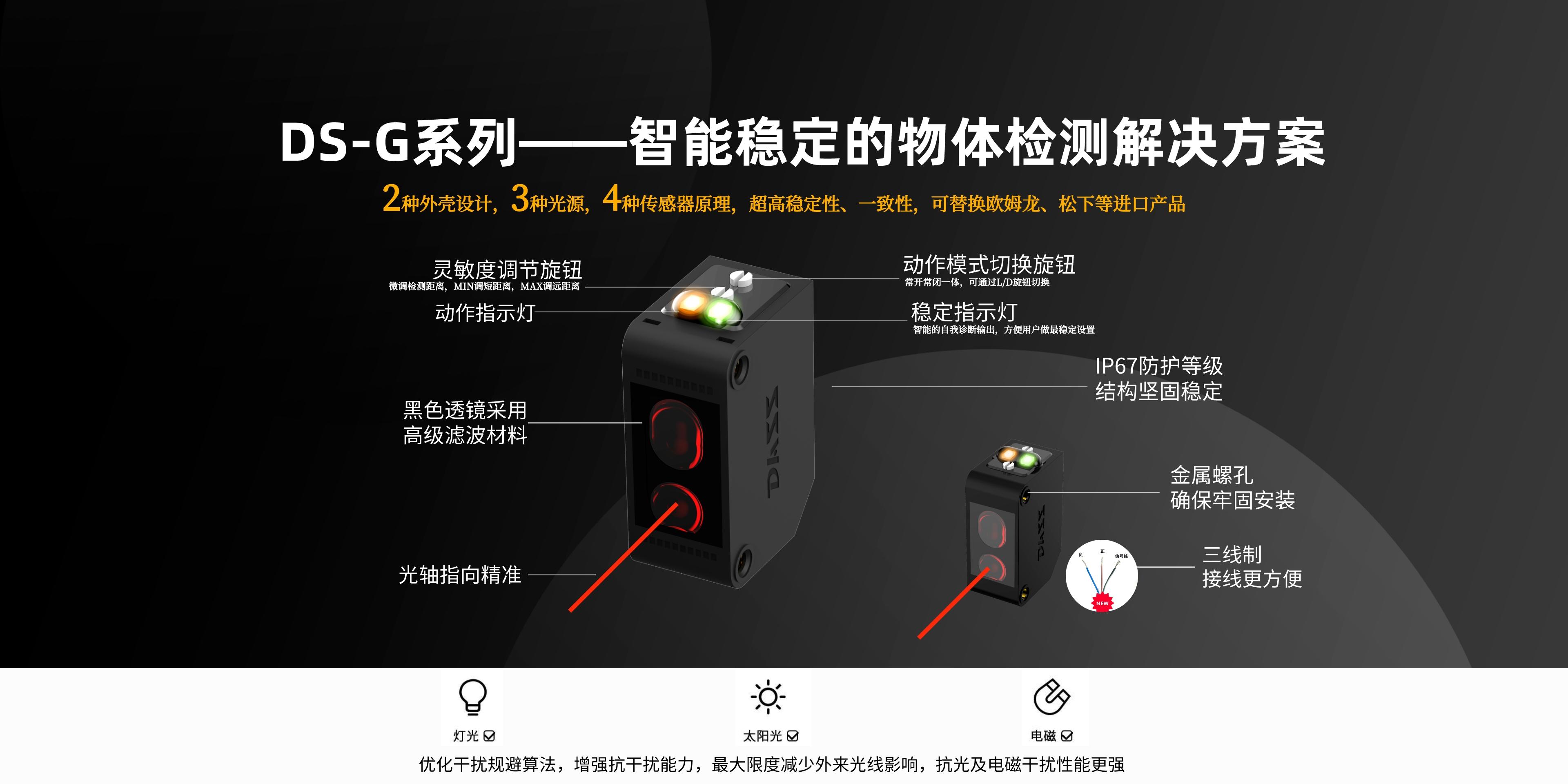 大深G系列通用型方型光電傳感器有很多種,按照光源分類:不可見紅外光、可見紅色光、激光;按照工作方式分:漫反射式、回歸反射式、對射式。