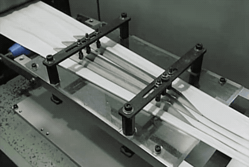 口罩表面疊成完成后,接下去就是把面料裁斷成一個個口罩大小,然后用無紡布進行補邊。